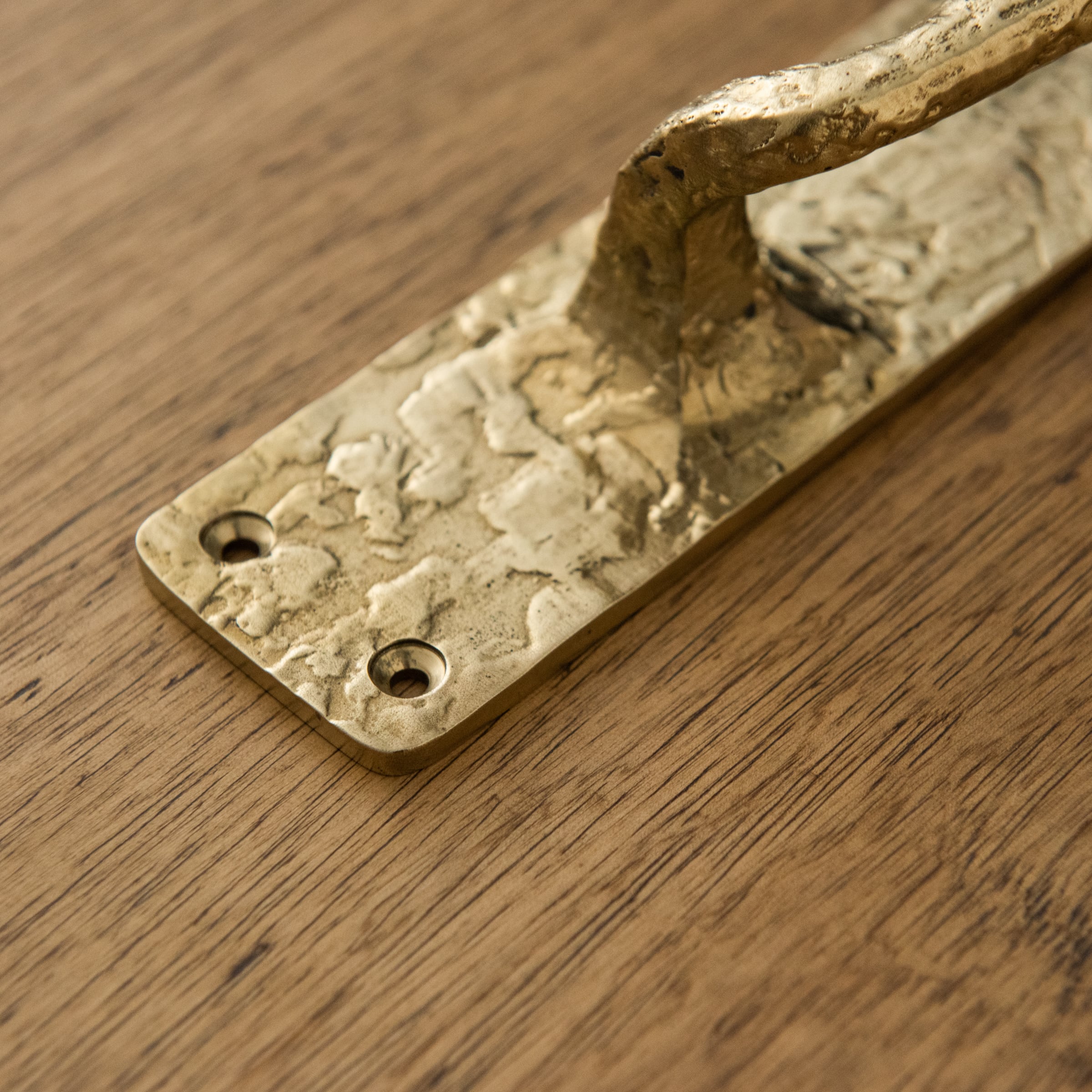 無垢の真鍮の表面に独自の手法でパターン付けをすることで、独特な素朴さと重厚感を持ったハンドルとなっております。ラスティックやクラシカルな雰囲気のインテリアによく馴染むドアハンドルとなっております。